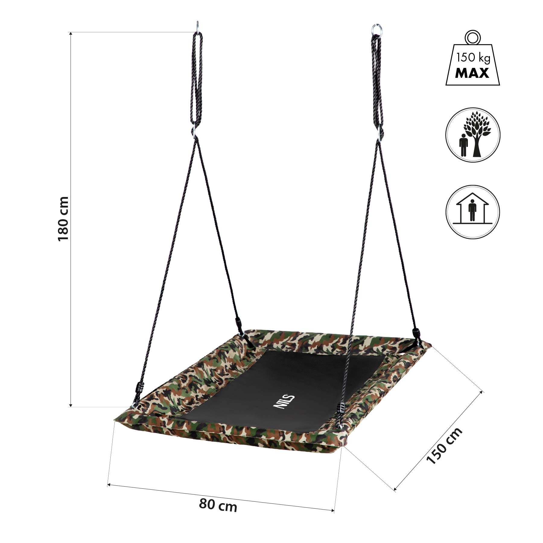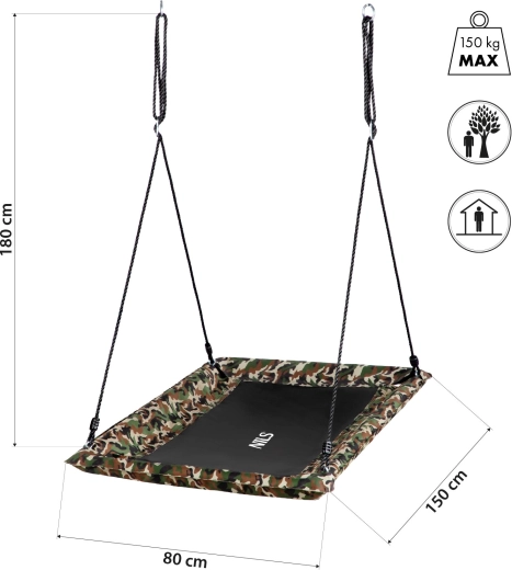 Datorită formei dreptunghiulare de 150 × 80 cm, obții o suprafață utilă mai mare decât la modelele clasice rotunde. Leagănul este confortabil pentru una sau două persoane – ideal pentru frați sau momente comune părinte-copil. Frânghiile reglabile până la 180 cm facilitează montarea pe cadru, grindă sau ramură.