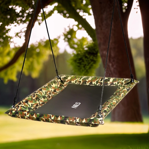 Platforma de legănare cu cadru din oțel și șezut din țesătură Oxford 600D durabilă îmbină durabilitatea cu confortul. Materialele rezistente la radiații UV și ploaie asigură o durată lungă de viață și o întreținere ușoară. Designul camuflaj oferă stil grădinii și îi încântă pe copii prin aspectul jucăuș.