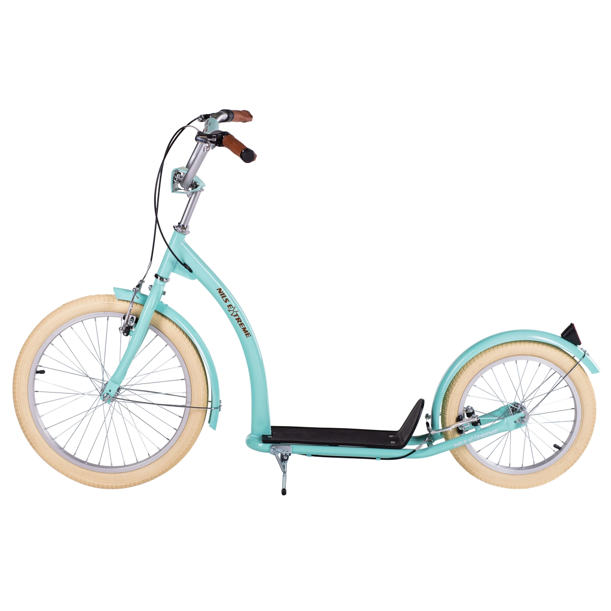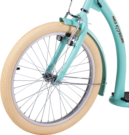 Trotineta NILS Extreme WH222 în culoare mentă este concepută pentru deplasări confortabile și sigure în oraș și în afara acestuia. Anvelopele pneumatice mari pe jante din aluminiu atenuează denivelările, iar cadrul din oțel asigură rezistență și durată de viață îndelungată. Roata față de 20" și cea spate de 16" sporesc stabilitatea, trecerea peste teren și siguranța în curbe.