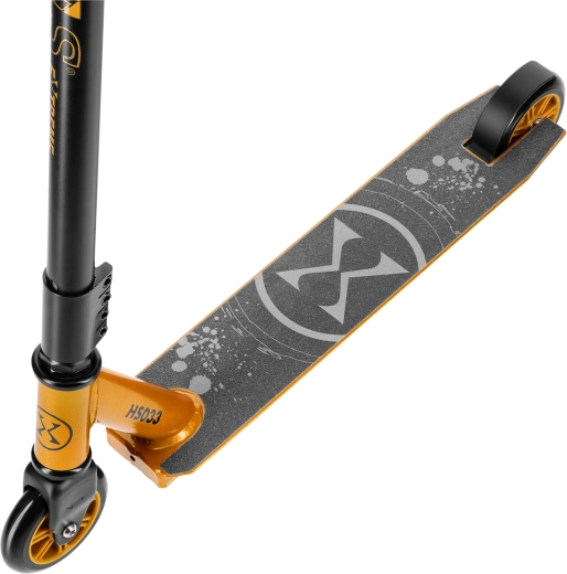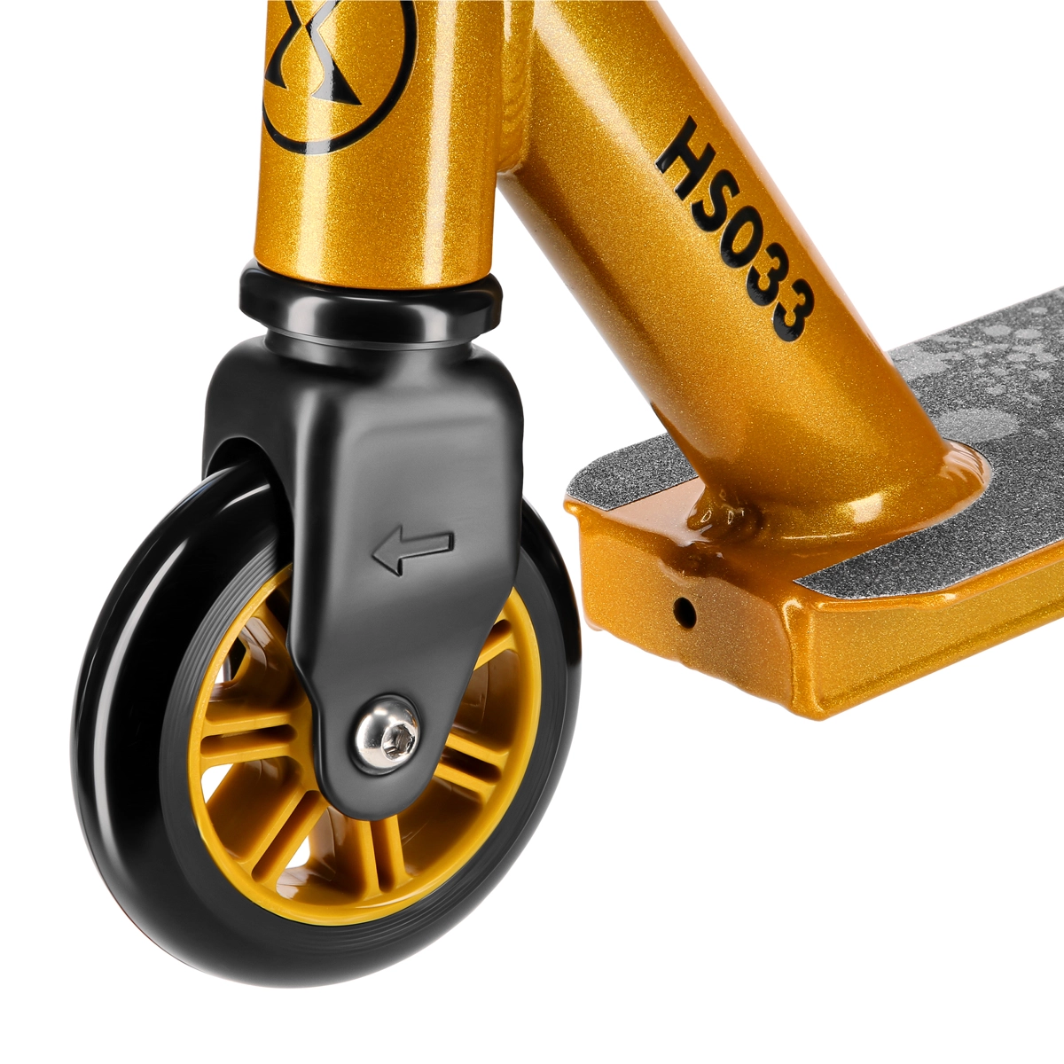 Căutați o trotinetă de trick-uri, pentru skatepark și pentru asfalt neted? Trotineta freestyle NILS Extreme în combinația negru‑auriu îmbină o construcție solidă cu greutate redusă de 2,8 kg. Deck-ul monocameral din aluminiu și ghidonul în T din oțel cu clemă în patru șuruburi rezistă unei utilizări exigente, în timp ce mânerele din cauciuc oferă o prindere sigură.