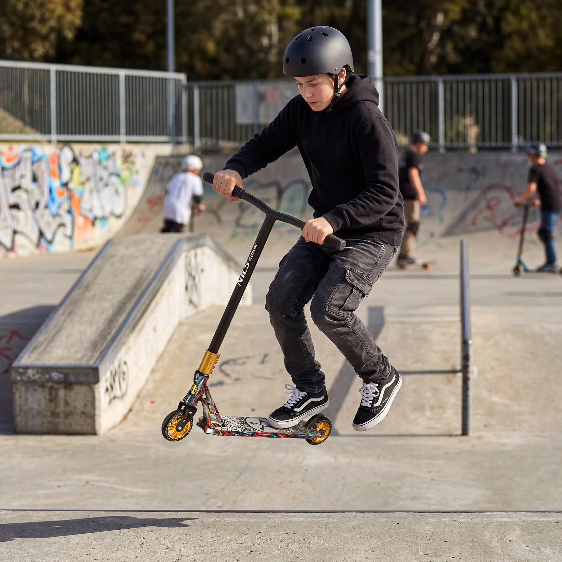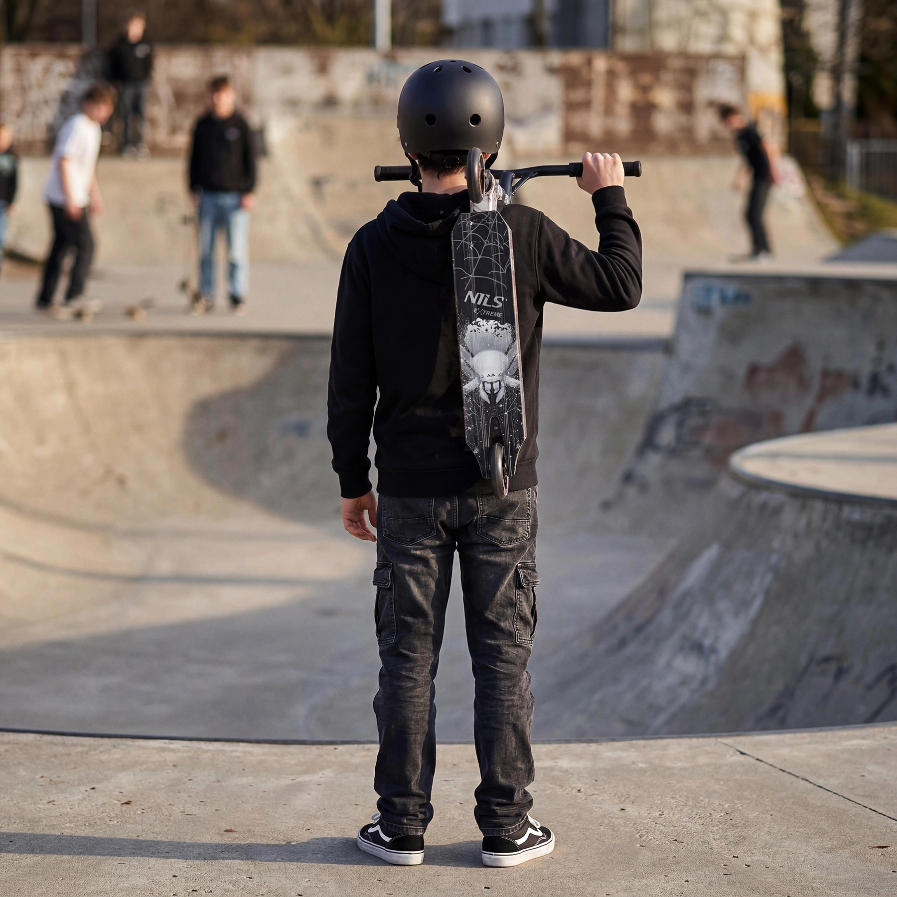 Trotineta NILS Extreme Spider HS221 este proiectată pentru trick-uri, sărituri și aterizări line. Cadrul solid fără mecanism de pliere crește rigiditatea, stabilitatea și precizia controlului. Ghidonul T-bar negru, cu mânere TPE confortabile, își păstrează direcția chiar și în trick-uri solicitante, în timp ce deck-ul compact, cu grip aderent, oferă siguranță sub picioare.