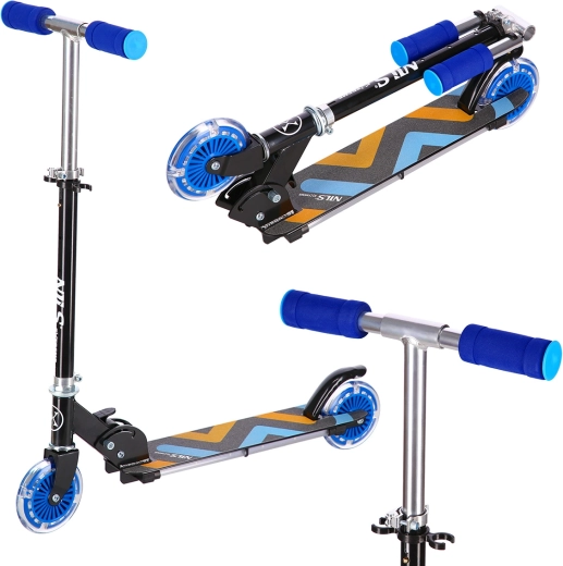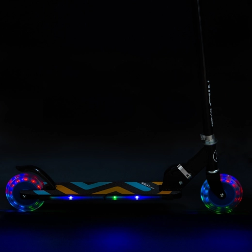 Trotinetă pliabilă ușoară și rezistentă pentru copii și adolescenți, cu roți cu LED-uri și platformă iluminată. Oferă ghidon reglabil pe înălțime în 4 poziții, pliare rapidă pentru transport facil și o deplasare lină datorită rulmenților ABEC 5. Ideală pentru asfalt și alei întărite, cu capacitate de încărcare 50 kg și greutate de doar 2,3 kg.