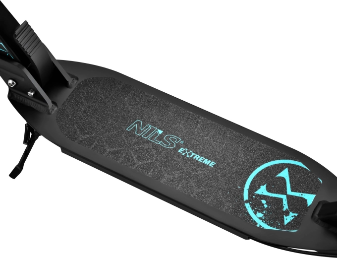 Trotineta NILS Extreme HM124T, în culoare turcoaz, îmbină designul modern, calitatea execuției și siguranța. Datorită cadrului ușor din aluminiu, se transportă cu ușurință, fiind totodată robustă și fiabilă. Roțile mari din poliuretan cu diametrul de 200 mm și rulmenții preciși ABEC 7 asigură o rulare lină și silențioasă pe asfalt și pe trotuare consolidate.