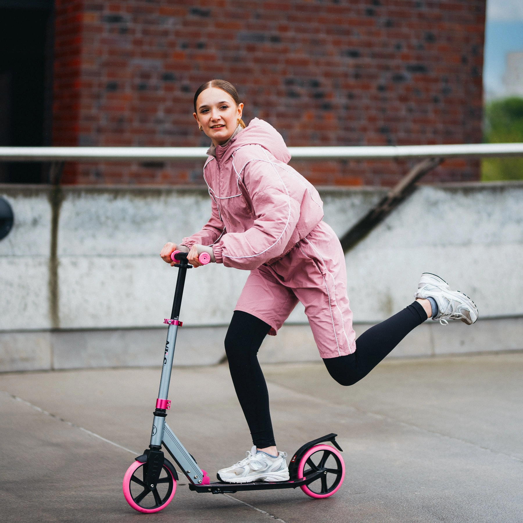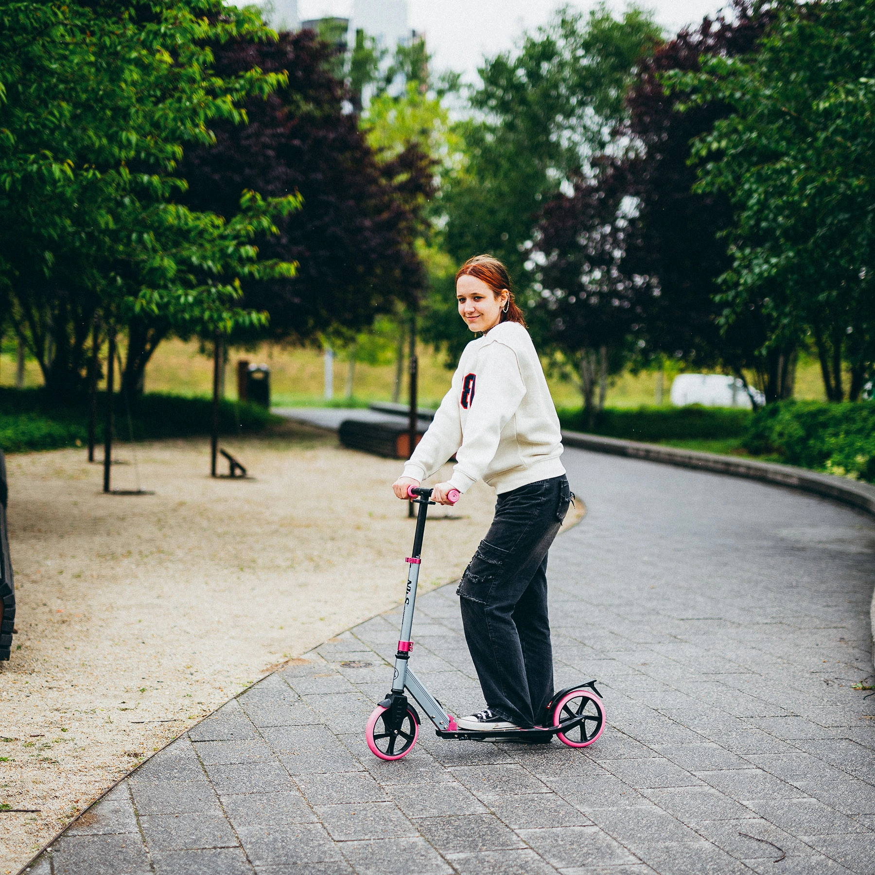 Roțile mari PU de 200 mm combinate cu rulmenți ABEC 7 oferă o deplasare lină și silențioasă pe asfalt și pe trotuare consolidate. Ghidonul cu mânere ergonomice TPR, înălțimea reglabilă a ghidonului (79–93 cm) și platforma joasă îmbunătățesc stabilitatea și confortul, iar frâna spate acționată cu piciorul asigură o oprire fiabilă.