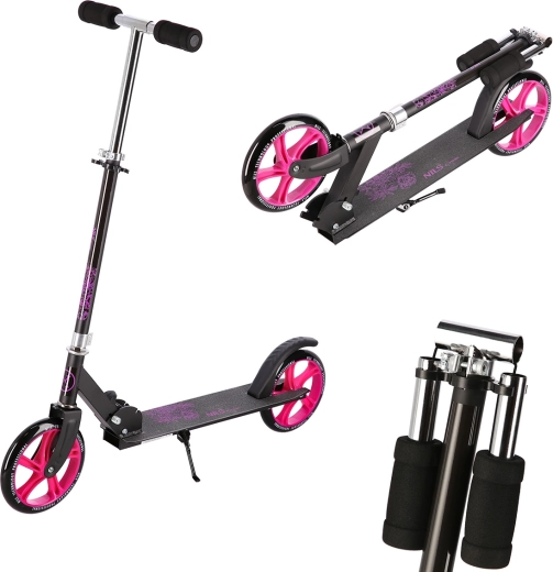 Roțile mari din PU de 200 mm cu rulmenți ABEC 7 garantează o deplasare rapidă, lină și stabilă pe asfalt și pavaj. Frâna spate cu picior oferă control instant al vitezei, iar cricul rabatabil permite parcarea trotinetei fără a o așeza pe jos. Sarcina maximă de 100 kg este potrivită atât pentru juniori, cât și pentru adulți recreaționali.