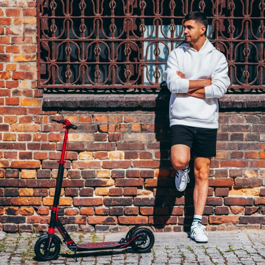 Pentru siguranță maximă, roata din spate este dotată cu frână pe disc și frână de picior cu reflector integrat pentru o vizibilitate sporită în lumină slabă. Înălțimea reglabilă a ghidonului și manșoanele ergonomice din cauciuc asigură o prindere confortabilă chiar și la drumuri mai lungi. Trotineta se pliază ușor la dimensiuni compacte, iar datorită curelei de umăr detașabile o poți transporta comod în transportul public, în mașină sau o poți depozita acasă.