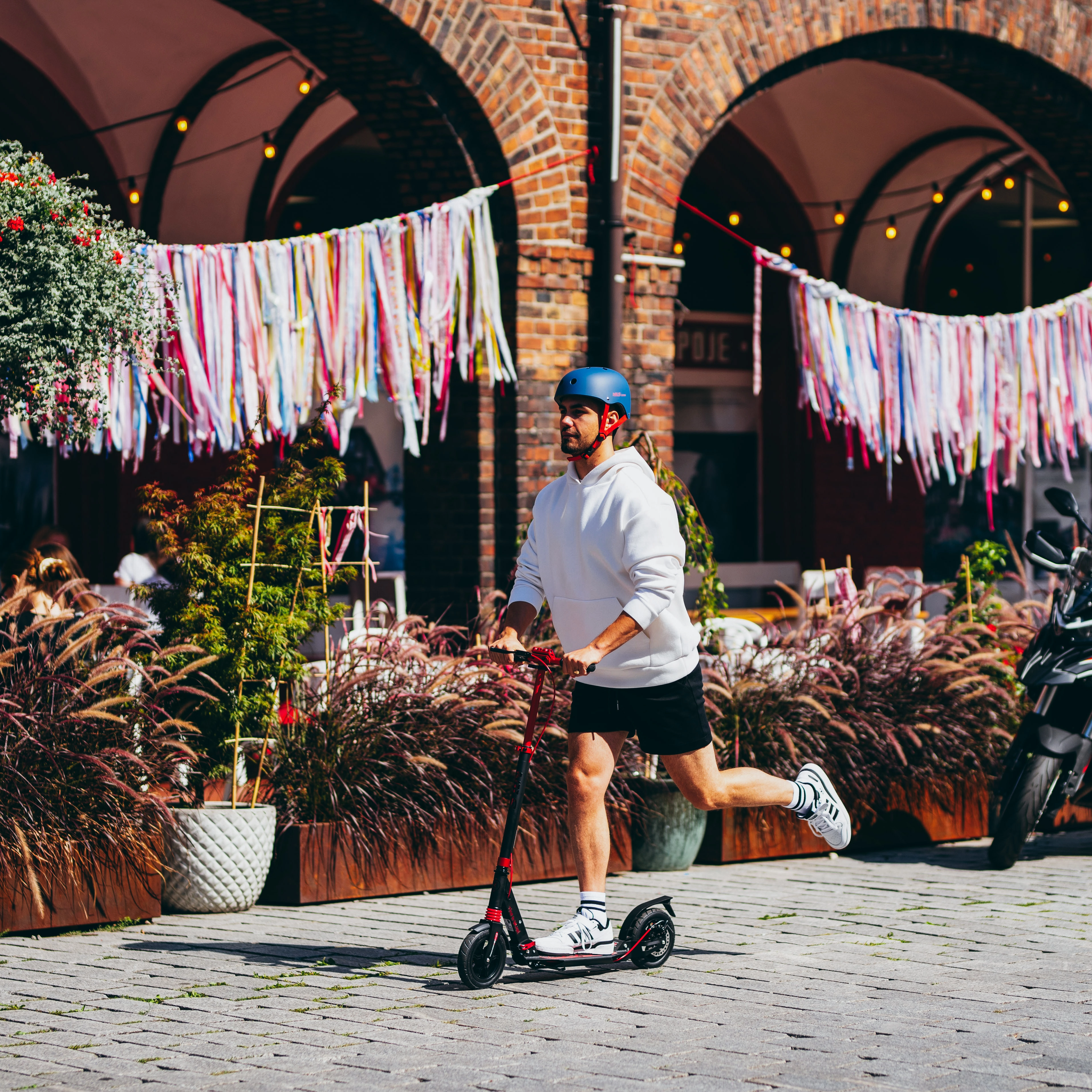 Amortizoarele față și spate absorb eficient denivelările străzilor urbane. În combinație cu roțile pneumatice de 200 mm, te deplasezi mai cursiv și cu mai puțină oboseală.