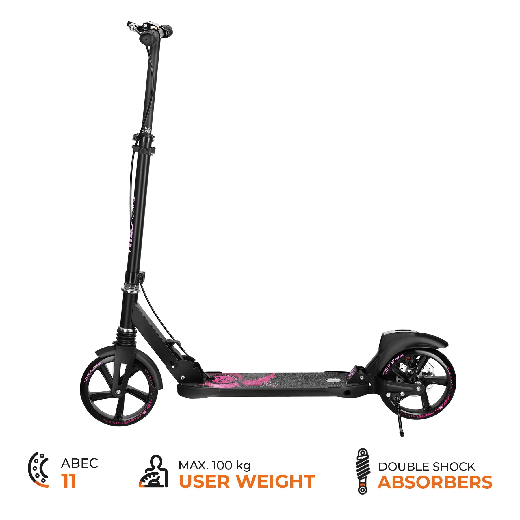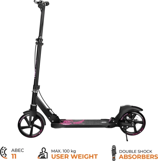 Descoperă o plimbare ușoară și stabilă cu trotineta NILS EXTREME Fly. Datorită roților mari de 200 mm, rulmenților ABEC‑11 și amortizoarelor față și spate, te bucuri de trecere lină pe asfalt, trotuare și pavaj. Combinația durabilă de oțel și aluminiu asigură o durată lungă de viață, iar construcția pliabilă și cricul integrat facilitează utilizarea zilnică.