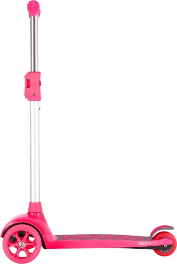 Trotinetă pentru copii NILS Fun, ușoară și stabilă, pentru primele plimbări și antrenarea echilibrului. Are trei roți pentru siguranță, roți cu LED pentru vizibilitate sporită, ghidon reglabil și frână spate acționată cu piciorul pentru oprire în siguranță.
