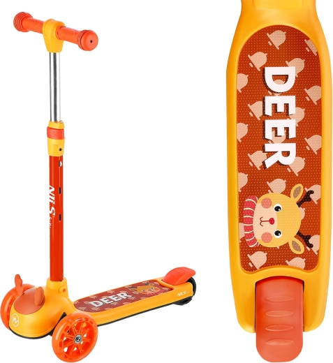 Trotineta tricycle pentru copii NILS Fun Deer este concepută pentru cei mai mici rideri, oferind stabilitate maximă, siguranță și distracție. Două roți frontale mari și o roată spate mai mică, cu iluminare LED, asigură un mers lin și bine vizibil, în timp ce sistemul de direcție prin înclinare îi învață pe copii să își mențină echilibrul în mod natural. Ghidonul cu mânere din cauciuc și capete de siguranță „bumbi” protejează palmele copiilor și previn alunecarea mâinilor.