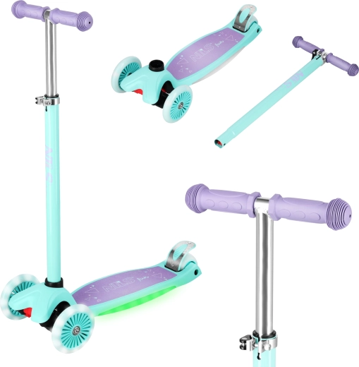 LED-urile integrate în roțile din față și pe platformă cresc siguranța pe înserat și oferă trotinetei un aspect atractiv. Platforma este alimentată de 3× AAA (LR03).