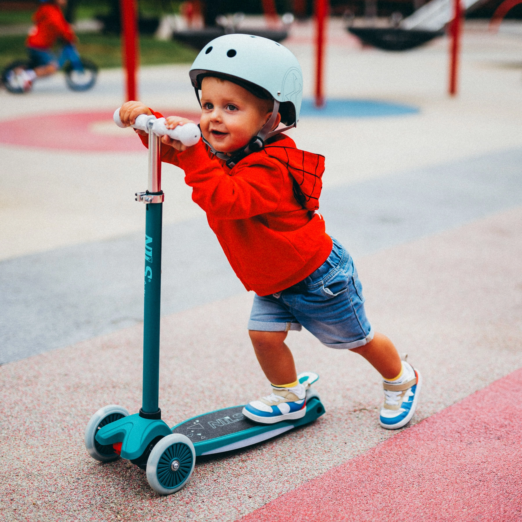 Două roți frontale și direcția prin înclinare îi ajută pe copii să vireze în siguranță fără a răsuci ghidonul. Platforma lată și frâna spate măresc controlul în timpul mersului.