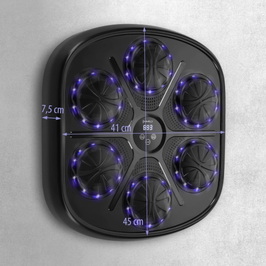 Datorită Bluetooth și difuzorului încorporat, îți poți reda muzica preferată direct în timpul antrenamentului. Alimentarea pe acumulator și încărcarea USB‑C facilitează utilizarea zilnică. Montajul se face într-o clipă – ținta se fixează cu benzi velcro și autocolante fără găurire, fiind ideală pentru apartamente și spații mai mici.