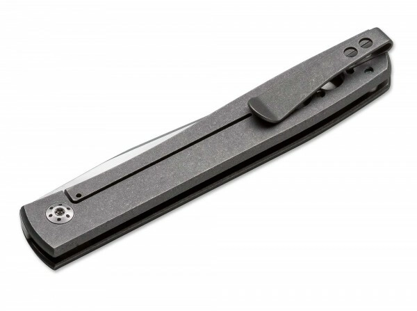 Lama se deschide manual, prin crestătura pentru unghie, fără flipper, iar după deschidere este asigurată de Framelock integrat în mânerul din titan. Orificiile de reducere a greutății scad masa și îmbunătățesc priza, în timp ce clipul de buzunar permite purtare discretă și adâncă.