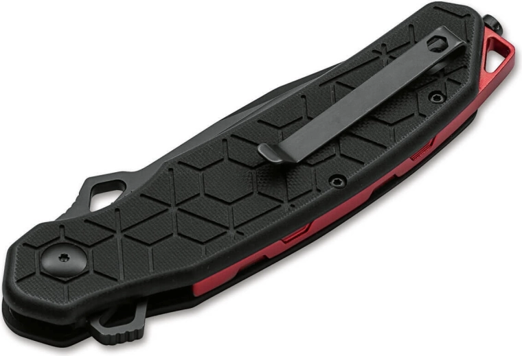 Mânerul ergonomic din G10 cu textură pronunțată tip fagure oferă priză sigură chiar și cu mănuși sau pe umed. Designul este completat de un spacer din aluminiu roșu, orificiu pentru șnur, clemă de buzunar practică și spargător de geamuri integrat pentru situații de urgență. Cuțitul este livrat într-o husă din nailon de calitate, care facilitează transportul și protecția instrumentului.