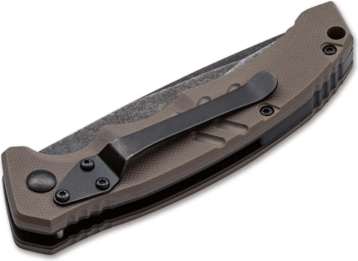 Mânerul ergonomic din G10 în culoare maro oferă o prindere fermă chiar și în condiții dificile. Clema de buzunar permite purtare discretă și confortabilă, iar orificiul pentru șnur este ideal pentru asigurare suplimentară sau personalizare.