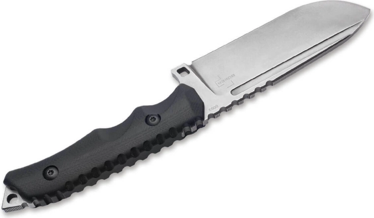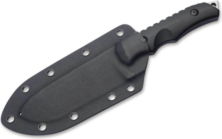 Mânerul texturat din G10 negru oferă o prindere sigură și confortabilă chiar și pe umezeală sau frig. Canelurile antiderapante la sprijinul pentru degetul mare și la capătul mânerului sporesc controlul asupra cuțitului. Spargătorul de geam integrat și orificiul pentru șnur extind funcționalitatea în situații de criză. TocuI Kydex inclus permite purtare sigură și versatilă.