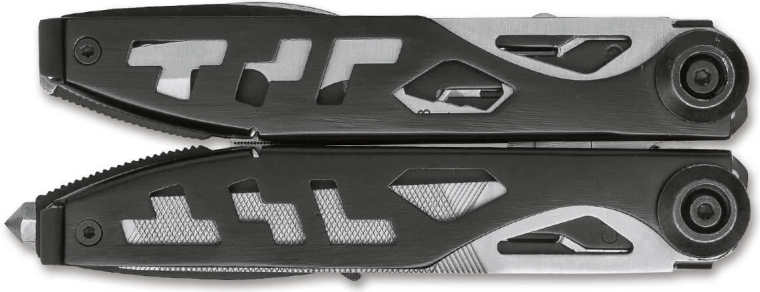 - Lama parțial zimțată, fierăstrău pentru lemn, pilă cu riglă, unealtă multifuncțională (deschizător de conserve, deschizător de sticle, îndoitore/dezizolator de sârmă, cheie imbus), tăietor de centură