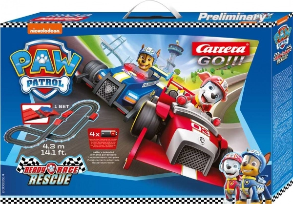 Intrați în lumea curselor cu CARRERA GO Patrula cățelușilor. Datorită lungimii pistei de 4,3 m și dimensiunilor asamblate de 147 × 120 cm, micii piloți se pot bucura de linii rapide, curbe strânse și o rampă plină de adrenalină. Mașinuțele la scară 1:43, cu magnet și perii duble, aderă excelent pe traseu și oferă o rulare lină.