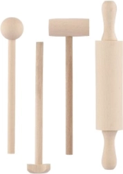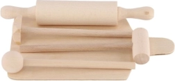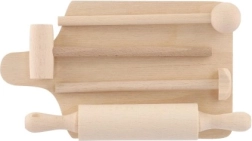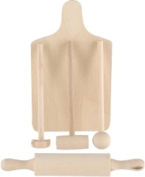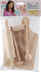 Setul este fabricat din lemn de calitate, cu suprafață netedă, pentru utilizare confortabilă și sigură. Datorită pieselor universale – tocător, sucitor și ciocănel – copiii pot imita cu ușurință pregătirea hranei și pot învăța activitățile de bază din bucătărie.