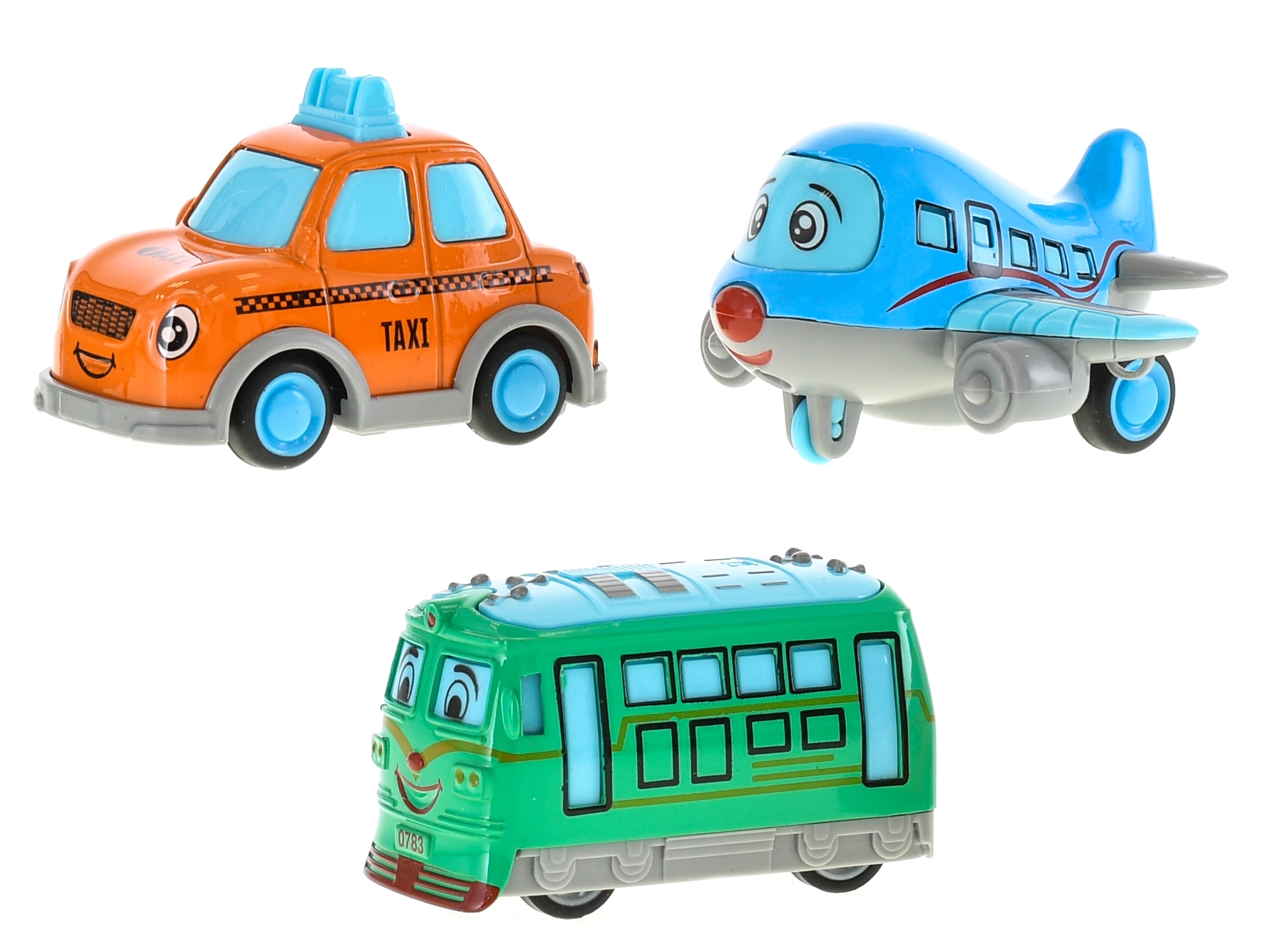 Fiecare pachet conține 3 vehicule și este disponibil în 2 variante – una cu avion, cealaltă cu barcă. Formele sigure, rotunjite și construcția solidă din metal și plastic garantează o durată lungă de viață chiar și la utilizare zilnică.