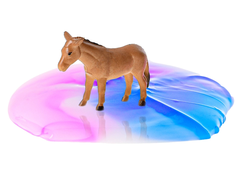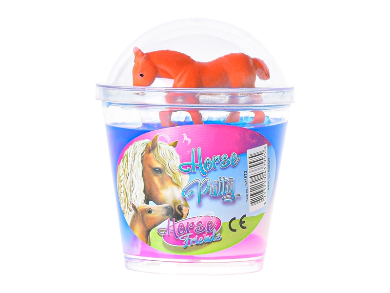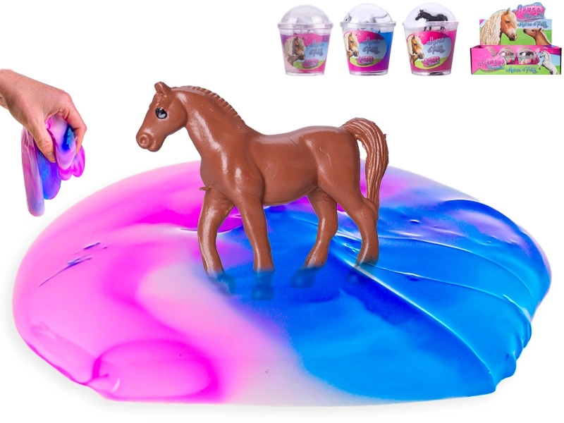 Un pahar plin de distracție colorată și un mic căluț din plastic în interior – acesta este slime-ul HORSE FRIENDS. Materialul se întinde plăcut, poate fi strâns și modelat și sprijină motricitatea fină și imaginația. Fiecare pahar aduce o mică surpriză sub forma unei figurine colecționabile de cal.