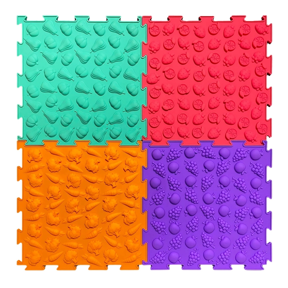 Fiecare placă are o structură și un relief diferit (fructe, legume și modele jucăușe) care masează delicat tălpile, susțin circulația sângelui și dezvoltă simțul tactil.