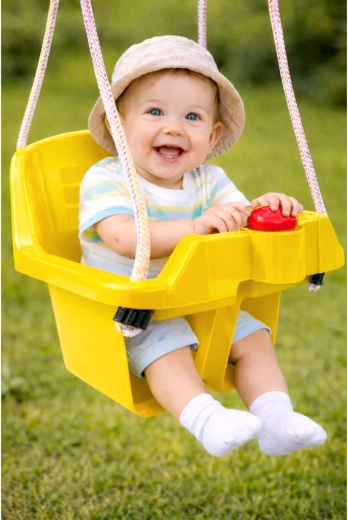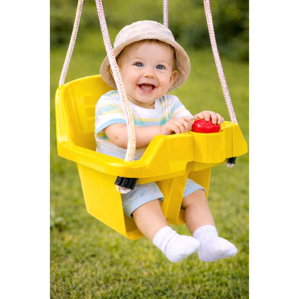 Leagăn galben tip găleată, sigur pentru cei mai mici, cu șezut adânc, spătar înalt și bară frontală de protecție pentru o poziție stabilă. Frânghiile împletite rezistente asigură o agățare fiabilă acasă sau în grădină, iar butonul mic de pe tăviță funcționează ca un claxon distractiv. Sarcină maximă 19 kg, certificare CE și plastic durabil potrivit pentru utilizare în exterior.