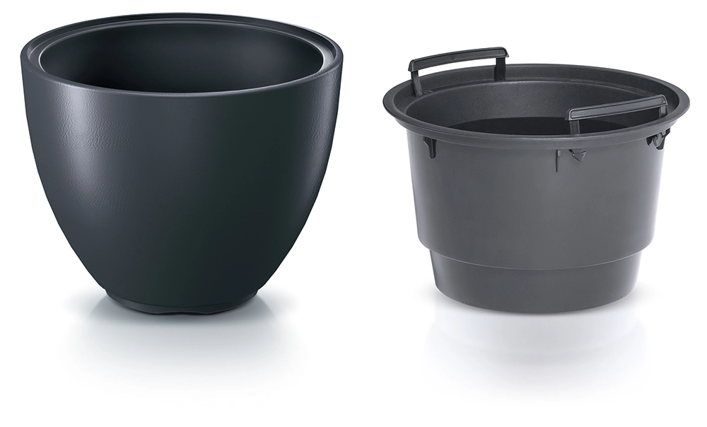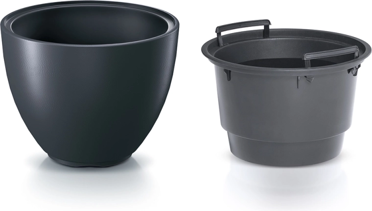 Elegantul ghiveci HEOS cu inserție, cu diametrul de 46,9 cm, în culoare antracit, este ideal pentru interior și exterior. Oferă un design modern minimalist, plastic rezistent la îngheț, UV și temperaturi ridicate și manipulare ușoară datorită inserției interioare. Se potrivește perfect în locuințe, birouri și spații comerciale.