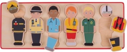 Fiecare personaj este compus din trei părți, permițând copiilor să combine ținutele și să recunoască rolurile celor care ajută în societate. Această jucărie din lemn de calitate susține dezvoltarea vocabularului și abilitatea de comunicare prin discuții despre diverse profesii.