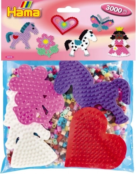 Setul oferă aprox. 3000 de mărgele, 4 plăci-suport cu forme și hârtie pentru călcat într-un săculeț practic. Start ideal pentru creații fără cumpărături suplimentare.