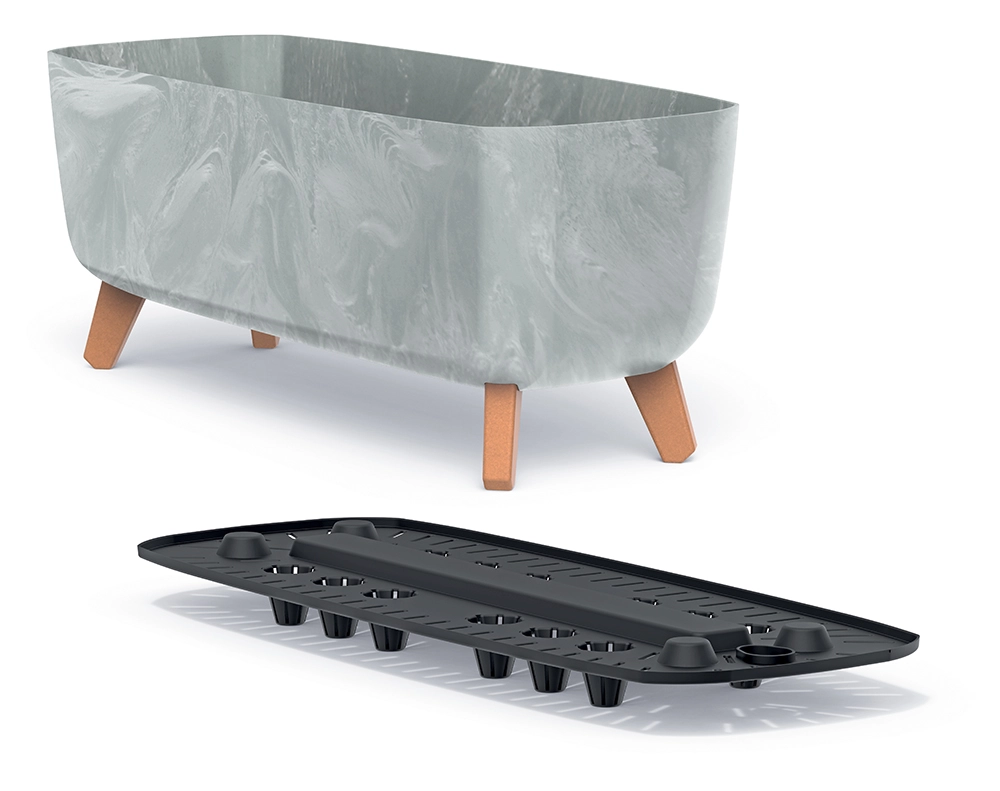 Datorită compoziției materiale cu până la 33% lemn, suprafața are un aspect natural și pământiu. Construcția durabilă este stabilă la UV și 100% reciclabilă, astfel încât ghiveciul se potrivește excelent atât în living, cât și pe balcon sau terasă.