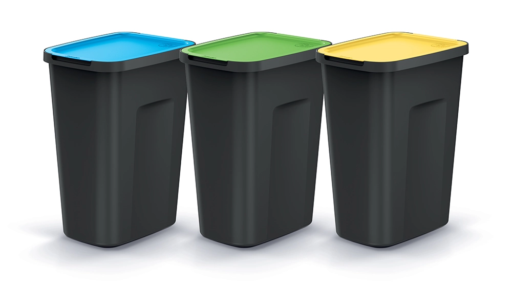 Set practic de trei coșuri COMPACTA Q FLAP PLUS cu volum de 3×35 l, din plastic reciclat, oferă sortare eficientă a deșeurilor pentru locuințe și birouri. Dimensiuni compacte, design modern și capac cu funcție stay open pentru depunerea comodă a deșeurilor. Suprafață rezistentă la alcool, grăsimi și uleiuri, ușor de curățat cu apă caldă și un detergent delicat.
