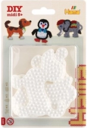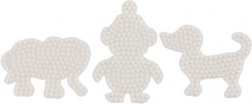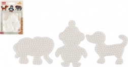 Setul Hama de suporturi pentru margele termoadezive permite copiilor de la 5 ani să creeze imagini colorate datorită suporturilor albe din plastic în formă de elefant, pinguin și cățeluș.