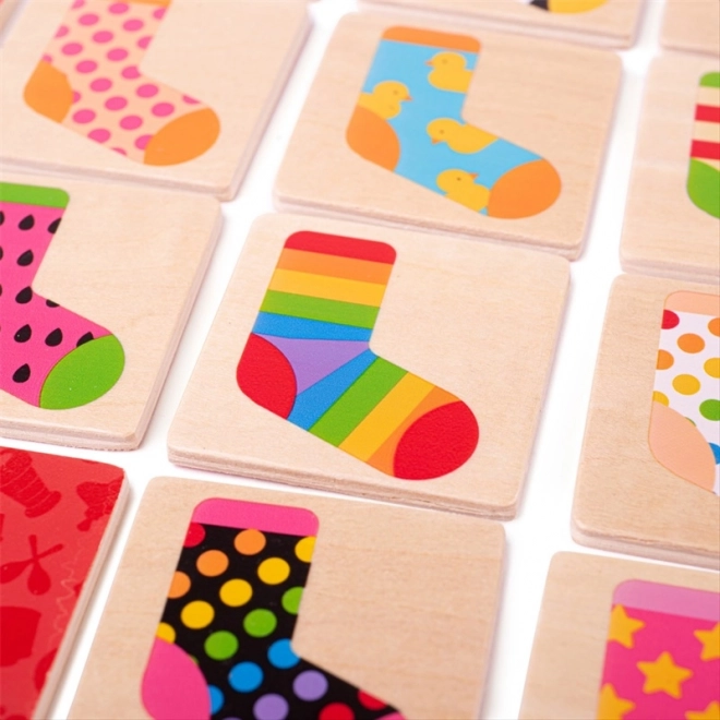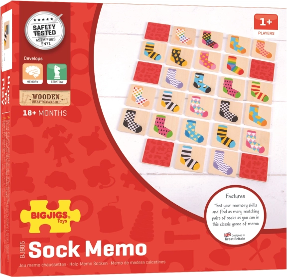 Îmbogățiți momentele de joacă cu copiii folosind pexeso din lemn cu șosete. Acest joc stimulează memoria și sprijină concentrarea și dezvoltarea abilităților strategice. Tot ce trebuie să faceți este să așezați cele 32 de piese de joc din lemn cu fața în jos și să începeți să descoperiți două piese simultan. Dificultatea crește treptat, jucătorul încercând să potrivească perechile de șosete și să dobândească noi strategii.