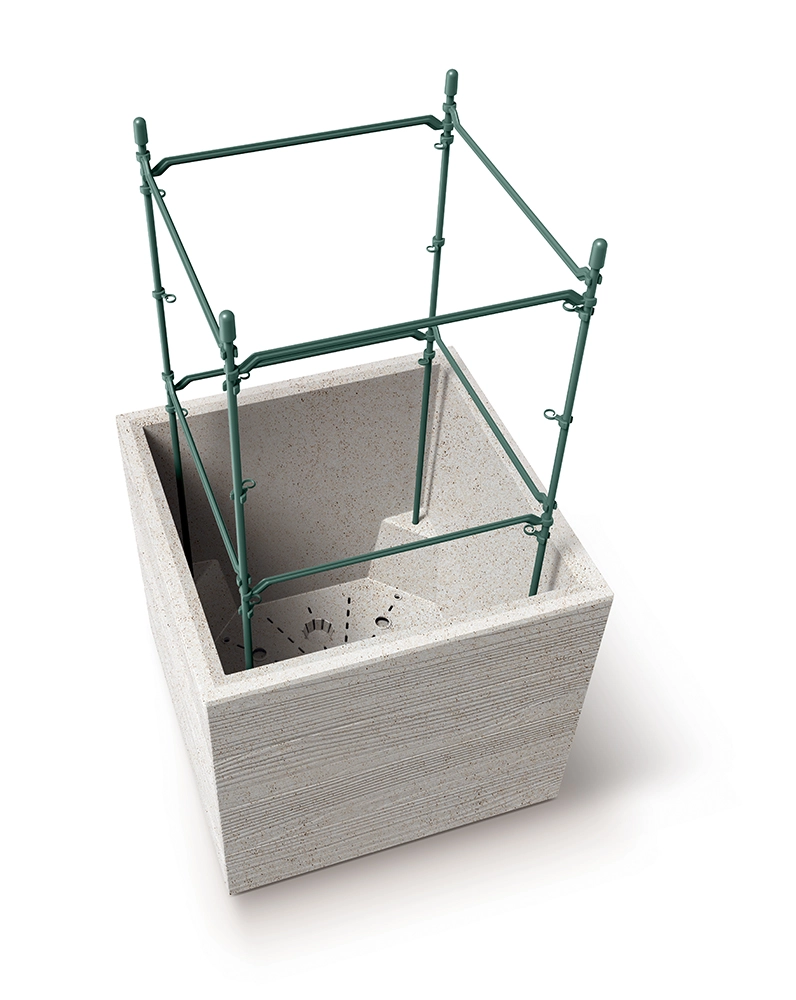 Peretele interior împarte spațiul în două zone, iar inserțiile integrate îmbunătățesc drenajul și ușurează transplantarea. Ideal pentru combinarea ierburilor aromatice sau a plantelor ornamentale.