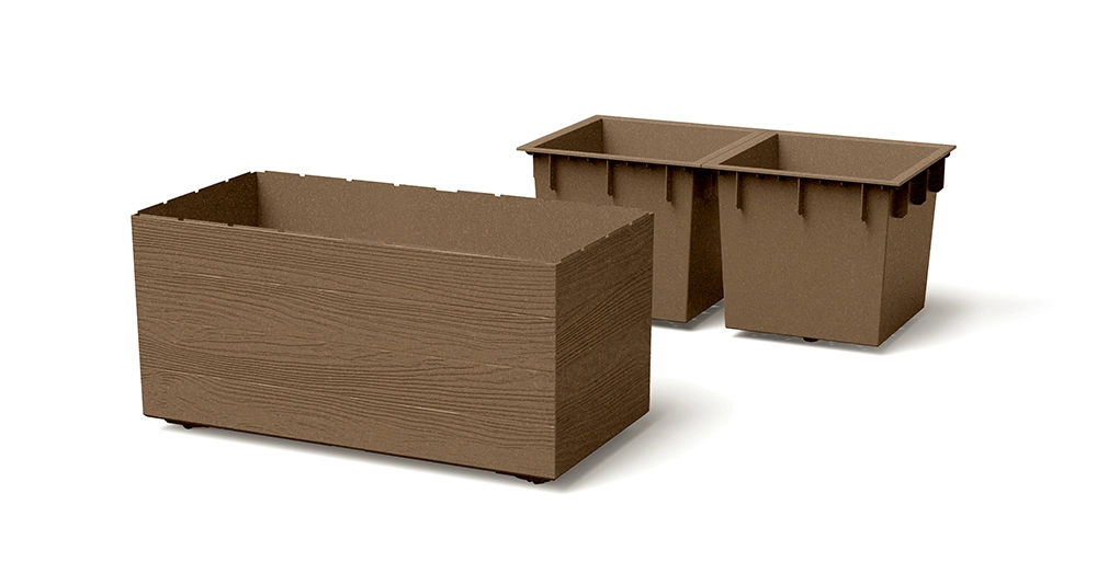 Ghiveciul stilat Madera Case Eco Wood cu lungimea de 57,7 cm, în eleganta nuanță cafea, imită fidel textura lemnului și este potrivit atât pentru interior, cât și pentru exterior. Este realizat din plastic rezistent cu protecție UV, oferă structură stivuibilă, două compartimente separate cu inserții integrate pentru o mai bună scurgere a apei și rotițe pentru manipulare ușoară.