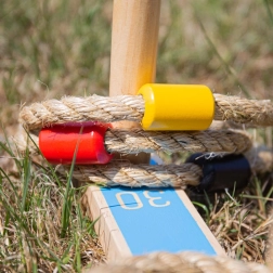 Structura din lemn și inelele groase din sfoară rezistă entuziasmului jucătorilor și utilizării în grădină. Materialele naturale sunt plăcute la atingere și prietenoase cu mediul.