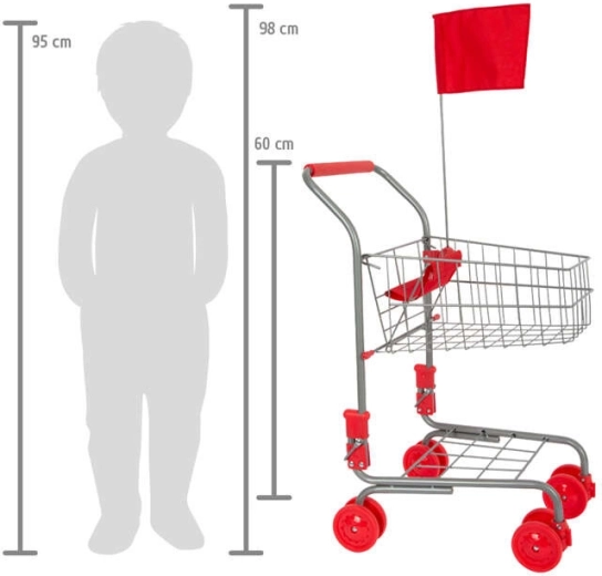 Căruciorul de cumpărături pentru copii SMALL FOOT, argintiu, cu design realist, impresionează prin construcția metalică stabilă, accentele roșii și stegulețul de siguranță. Datorită roților frontale pivotante, căruciorul se manevrează ușor chiar și în spații mai mici, iar copiii pot „cumpăra” confortabil ca părinții.