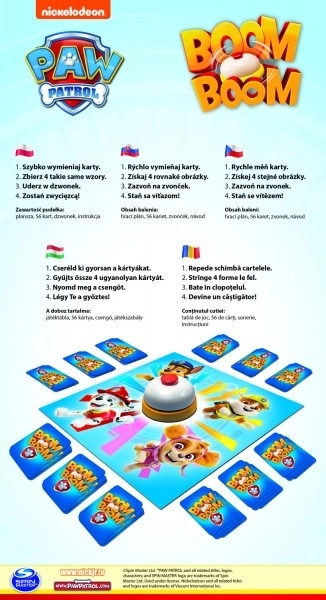 Pentru distracția de neuitat cu jocul Boom Boom Patrula Cățelușilor, aveți nevoie doar de simțuri și reacții rapide. Jocul decurge simultan pentru toată lumea, unde încercați să vă schimbați cărțile și să obțineți un set de patru același tip cât mai repede posibil. Cine ajunge primul la obiectivul său, sună clopoțelul pentru a-și anunța reușita!