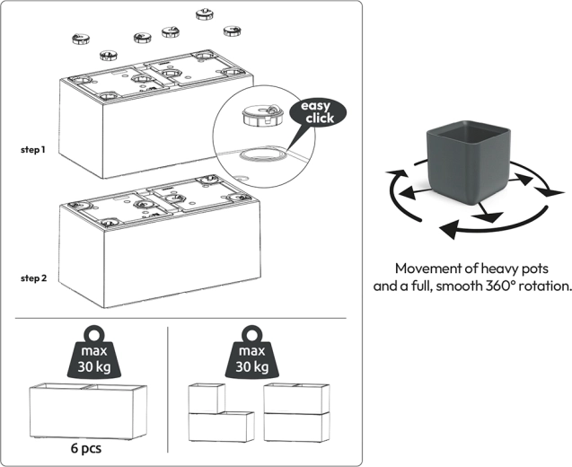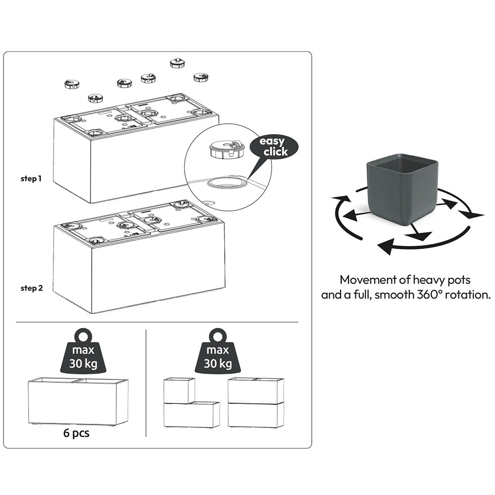 Pereții groși și construcția solidă din plastic de calitate rezistă la intemperii și radiații UV, iar suprafața mată are un aspect modern și se curăță ușor.