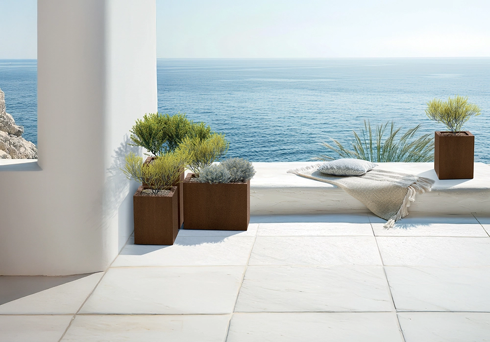 Forma minimalistă, unghiulară, în ton maro-ruginiu se potrivește frumos cu materialele naturale și evidențiază verdeața pe balcon, terasă și în living.