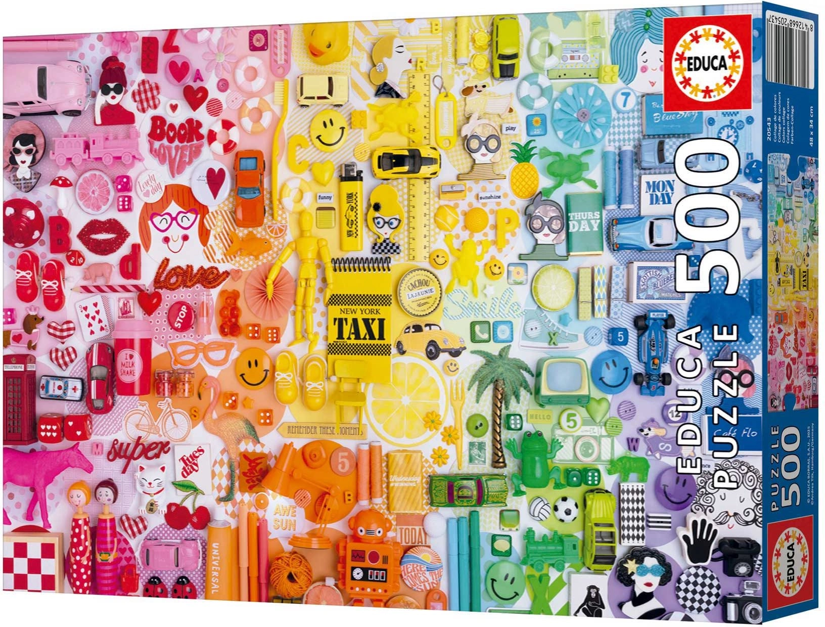 Bucurați-vă de relaxare cu puzzle-ul de calitate EDUCA cu 500 de piese. Vă așteaptă un colaj colorat plin de culoare, piese precise și adeziv gratuit pentru fixarea ușoară a imaginii finale. După asamblare, puzzle-ul are aproximativ 48 × 34 cm.