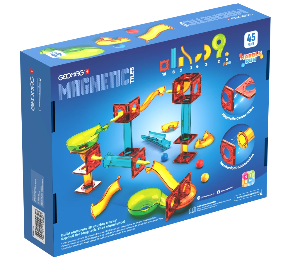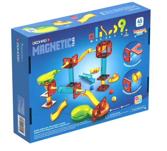 Această pistă de bile GEOMAG, în variantă colorată atrăgătoare, permite construirea de trasee originale cu diferite niveluri de înălțime, curbe și pâlnii. Piesele transparente asigură o cursă a bilelor captivantă vizual, care stimulează curiozitatea și experimentarea naturală.