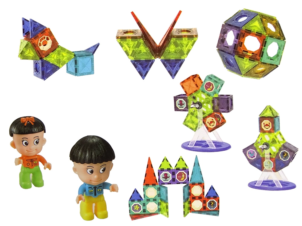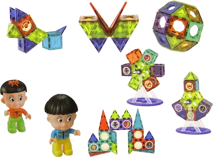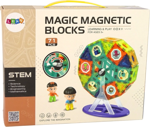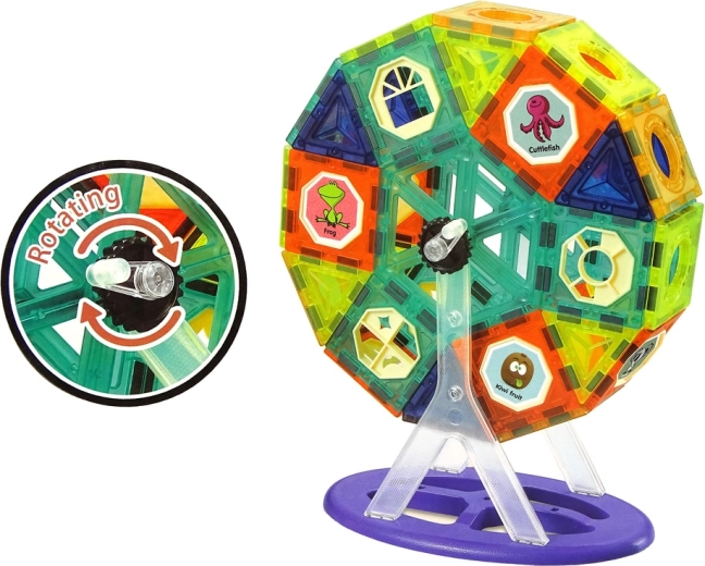 Acest set bogat include 71 de piese, inclusiv o bază specială cu mâner rotativ pentru construirea roții panoramice sau a caruselului. Sunt incluse și autocolante cu animăluțe, fructe și legume, care oferă construcțiilor un aspect jucăuș, precum și două figurine pentru joacă și mai distractivă. Datorită magneților puternici și îmbinărilor fiabile, iau naștere construcții 3D stabile, care îi vor încânta pe copii ore în șir.