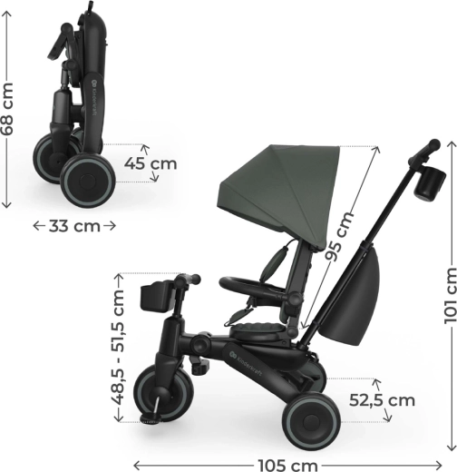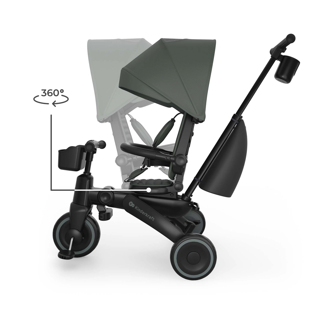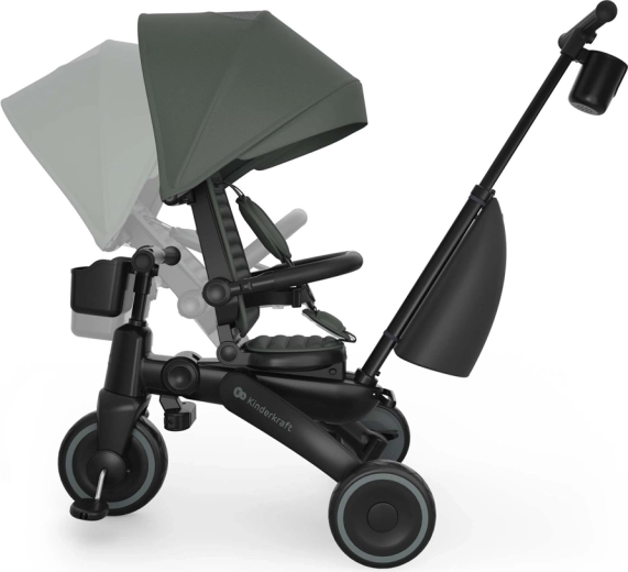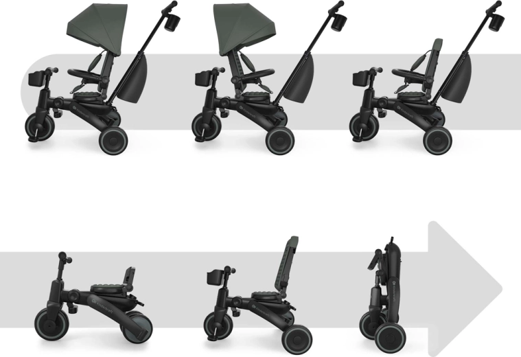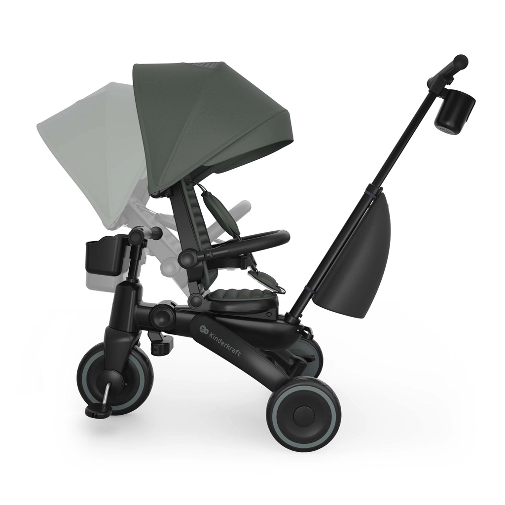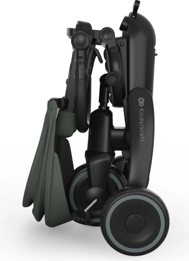 Cadrul pliabil cu blocare dublă asigură pliere rapidă și sigură la dimensiuni compacte. Tricicleta poate fi depozitată stabil atât vertical, cât și orizontal, lucru util în apartament, în lift sau în portbagajul mașinii. Copertina mare cu filtru UPF 50+ și tratament hidrofug protejează de soare și ploaie fină, iar panoul de ventilație și fereastra peek-a-boo îmbunătățesc circulația aerului și contactul cu copilul.