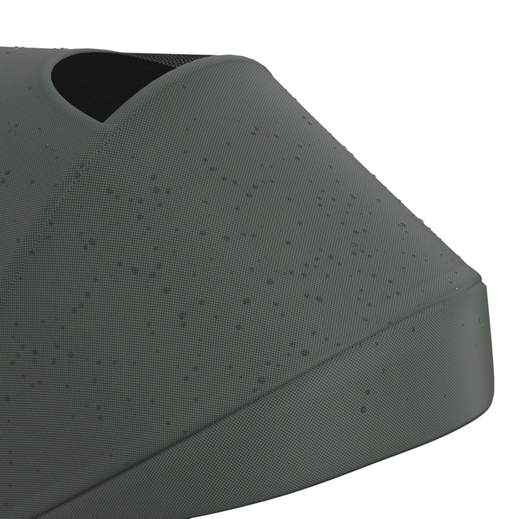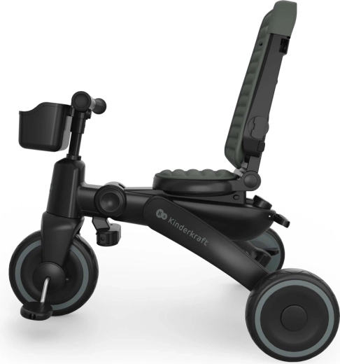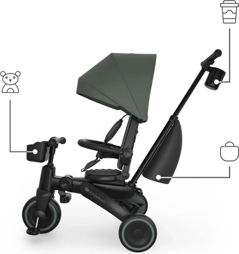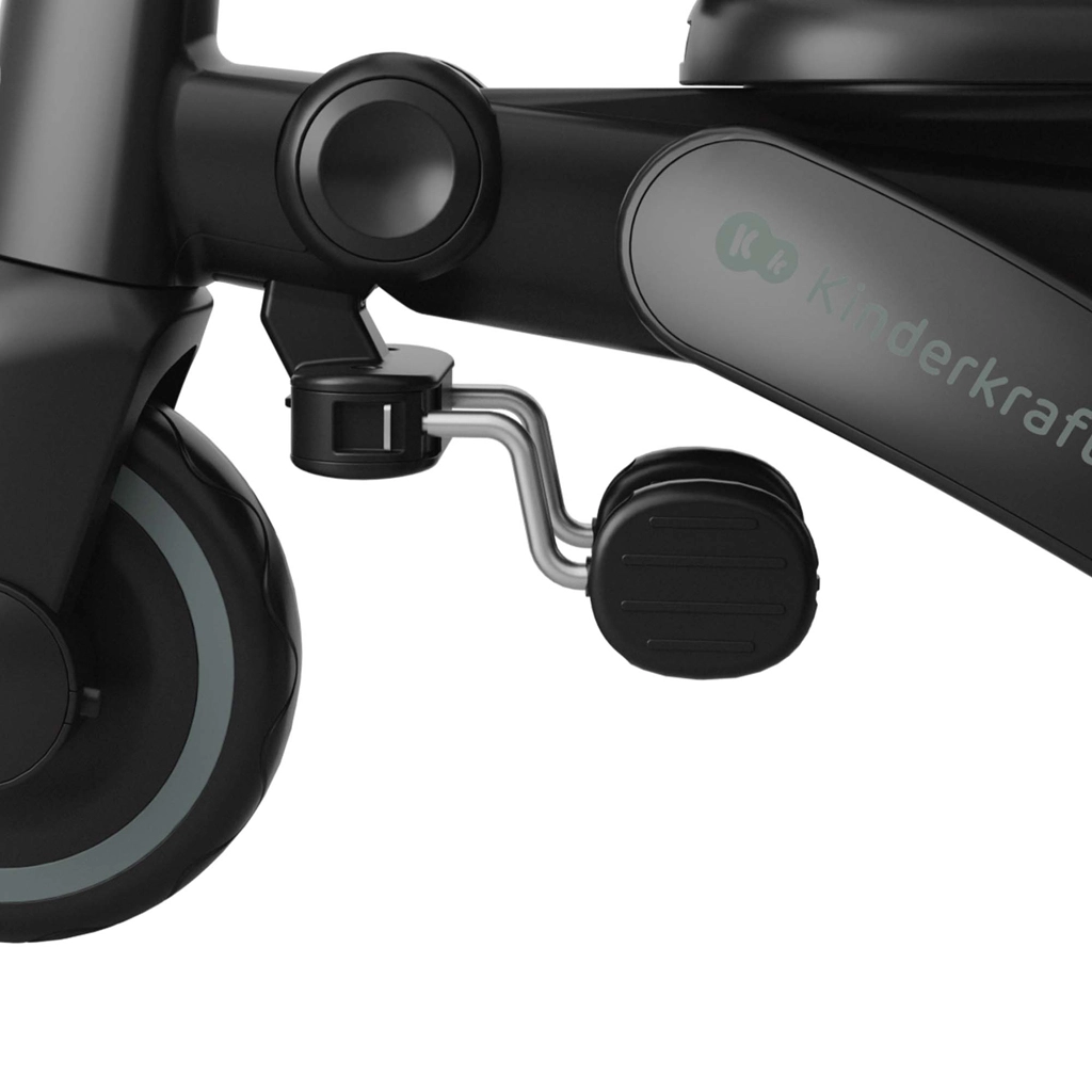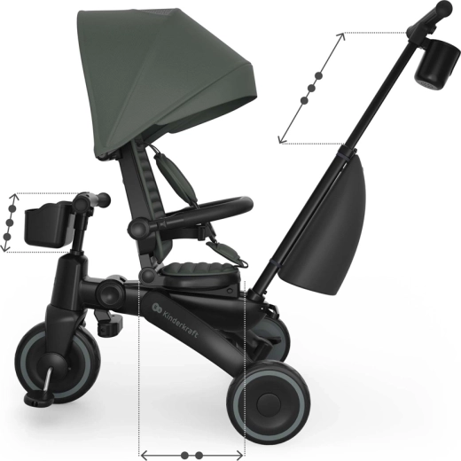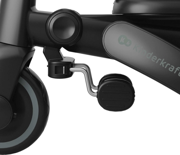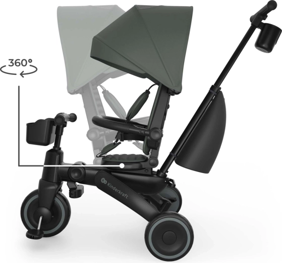 Cadrul pliabil cu blocare dublă asigură pliere rapidă și sigură la dimensiuni compacte. Tricicleta poate fi depozitată stabil atât vertical, cât și orizontal, lucru util în apartament, în lift sau în portbagajul mașinii. Copertina mare cu filtru UPF 50+ și tratament hidrofug protejează de soare și ploaie fină, iar panoul de ventilație și fereastra peek-a-boo îmbunătățesc circulația aerului și contactul cu copilul.