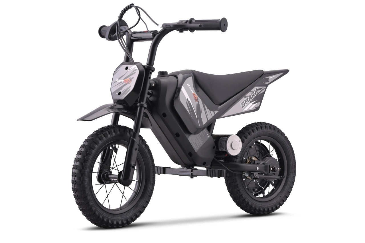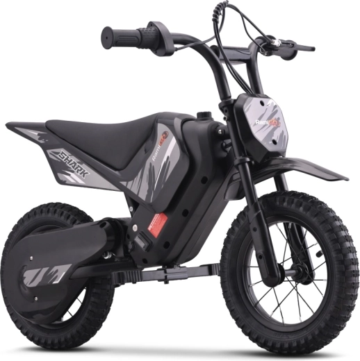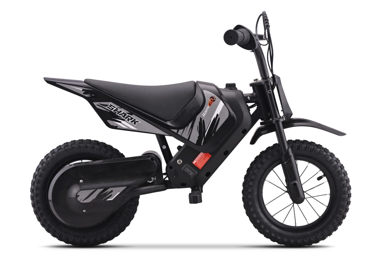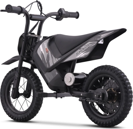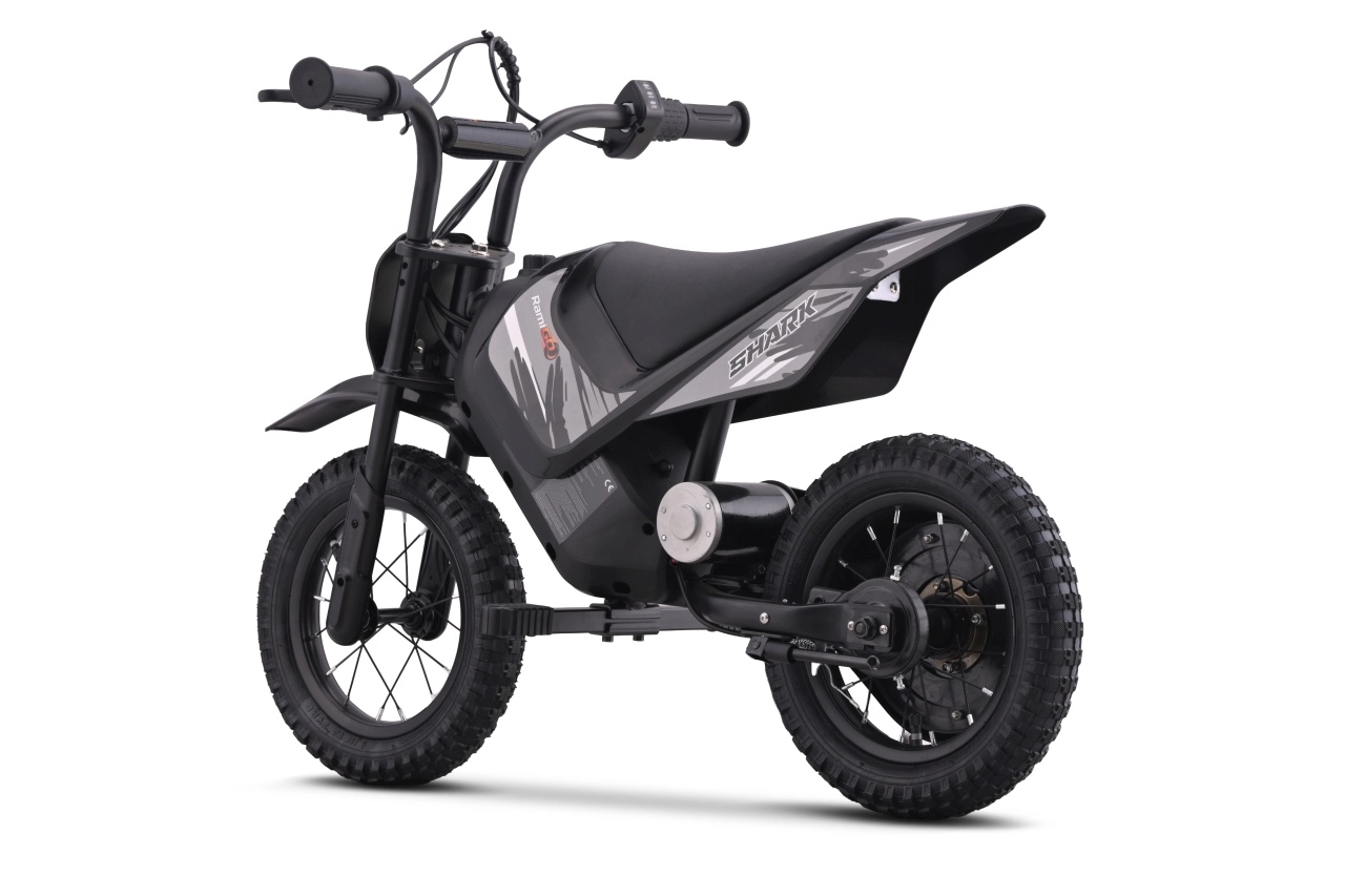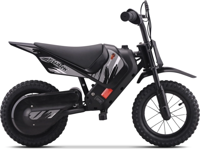 Motocicleta electrică compactă pentru copii SHARK, în eleganta culoare neagră, oferă propulsie electrică silențioasă de 150 W, două viteze la alegere și anvelope pneumatice de teren pentru tracțiune sigură off-road. Datorită cadrului solid din oțel cu vopsea pulbere, brațului oscilant spate întărit și indicatorului stării bateriei, este alegerea ideală pentru primele aventuri off‑road în siguranță ale copiilor.