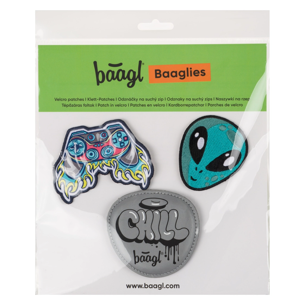 Setul BAAGL Baaglies Chill include trei patch-uri originale cu prindere pe arici – un controller de joc împodobit cu flăcări, un cap de extraterestru turcoaz și o etichetă gri „CHILL”. Datorită prinderii simple, le schimbați în clipă și adaptați aspectul rucsacului sau ghiozdanului intereselor actuale.