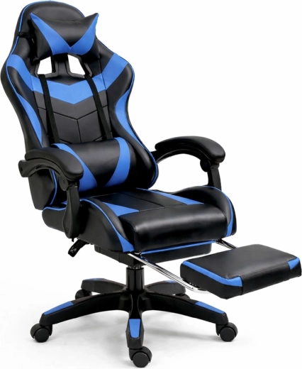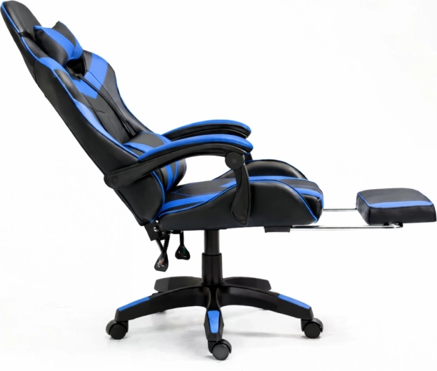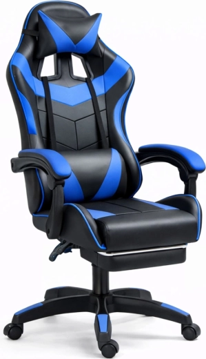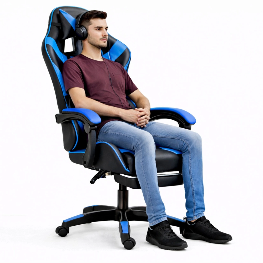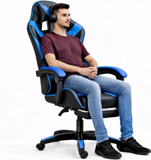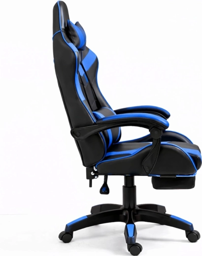 Scaunul ergonomic de gaming LEAN, în elegantul duo negru‑albastru, oferă spătar înalt cu pernă pentru cap și suport lombar, înclinare a spătarului până la 135°, reglare pe înălțime și suport extensibil pentru picioare pentru confort maxim la jocuri și muncă. Pielea ecologică rezistentă, baza rotativă 360° și steaua stabilă în cinci brațe cu roți asigură confort și mobilitate ușoară chiar și la ședințe îndelungate.